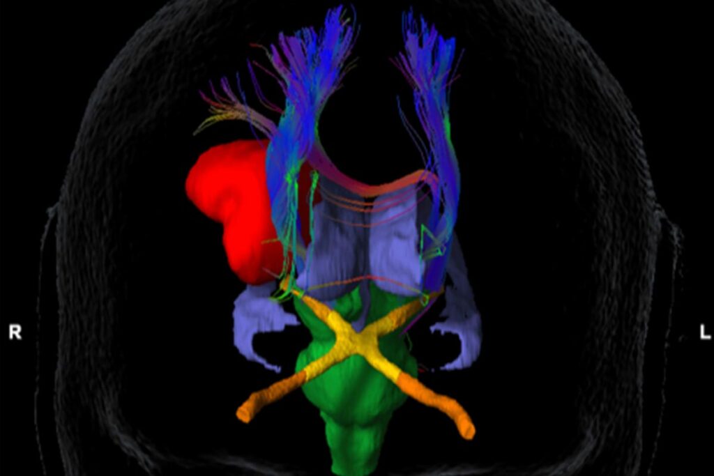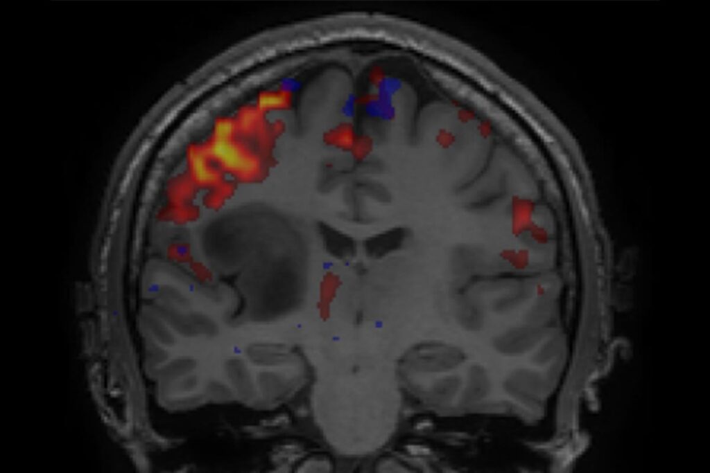 Hjernen styrer mange av kroppens funksjoner. Det finnes en rekke sentra i hjernen og disse er forbundet med nervebaner (nervefibre). Det går signaler ut til kroppen og det kommer signaler tilbake til hjernen. Hjernens funksjon kan påvirkes av både svulsten i seg selv og av behandlingen. Bildet viser en hjernesvulst (rødt) som ligger tett opp til motoriske baner (mørkeblått) og synsapparatet (gult).